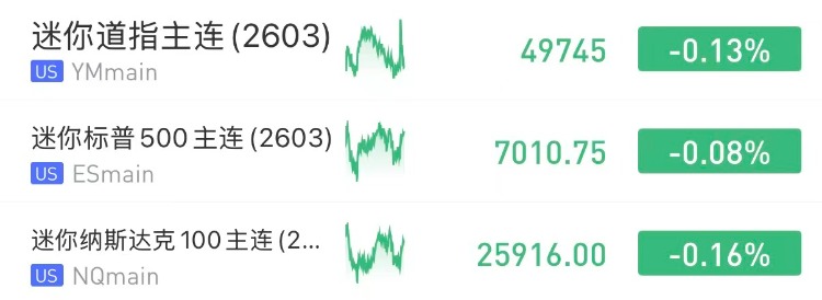 美股三大股指期货盘前小幅下跌,截至发稿,纳指期货 $NQmain 跌0.16%,标普500期货 $ESmain 跌0.08%,道指期货 $YMmain 跌0.13%。