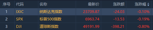 美股三大指数集体收跌,截至昨夜收盘,道指跌398.21点,跌幅为0.80%,报49191.99点;纳指跌24.03点,跌幅为0.10%,报23709.87点;标普500指数跌13.56点,跌幅为0.19%,报6963.71点。