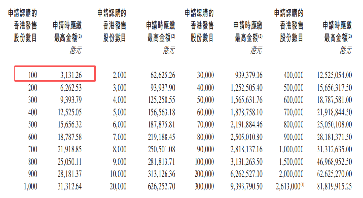 - 发售价格:每股发售价不高于31港元,每手100股,一手入场费3131.26港元