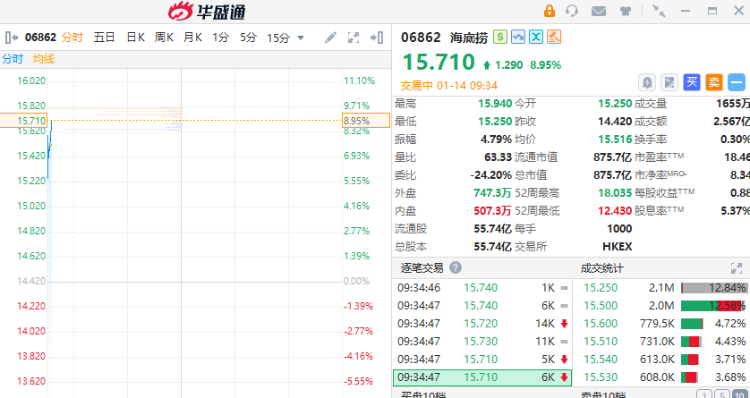 华盛资讯1月14日讯,海底捞早盘高开高走暴涨9%,创始人张勇重任CEO;港股消费股部分走高,截至发稿,农夫山泉大涨5%,友宝在线涨超15%。