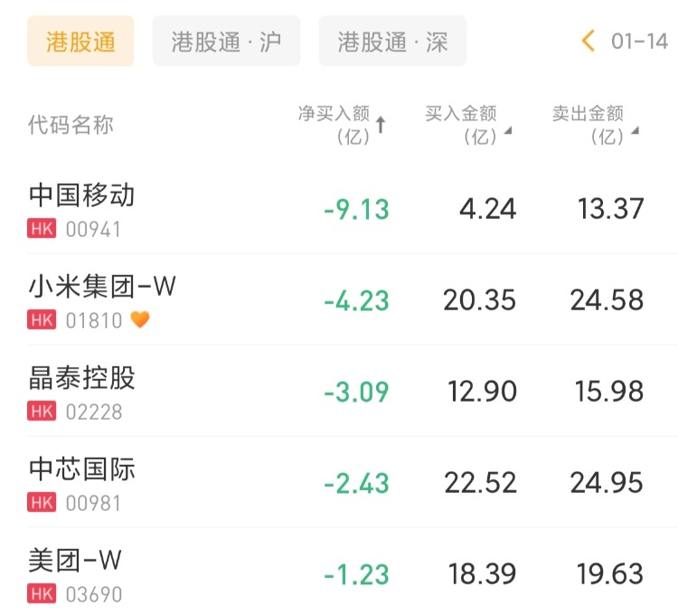 中国移动、小米集团-W、晶泰控股分别遭净卖出9.13亿港元、4.23亿港元、3.09亿港元。