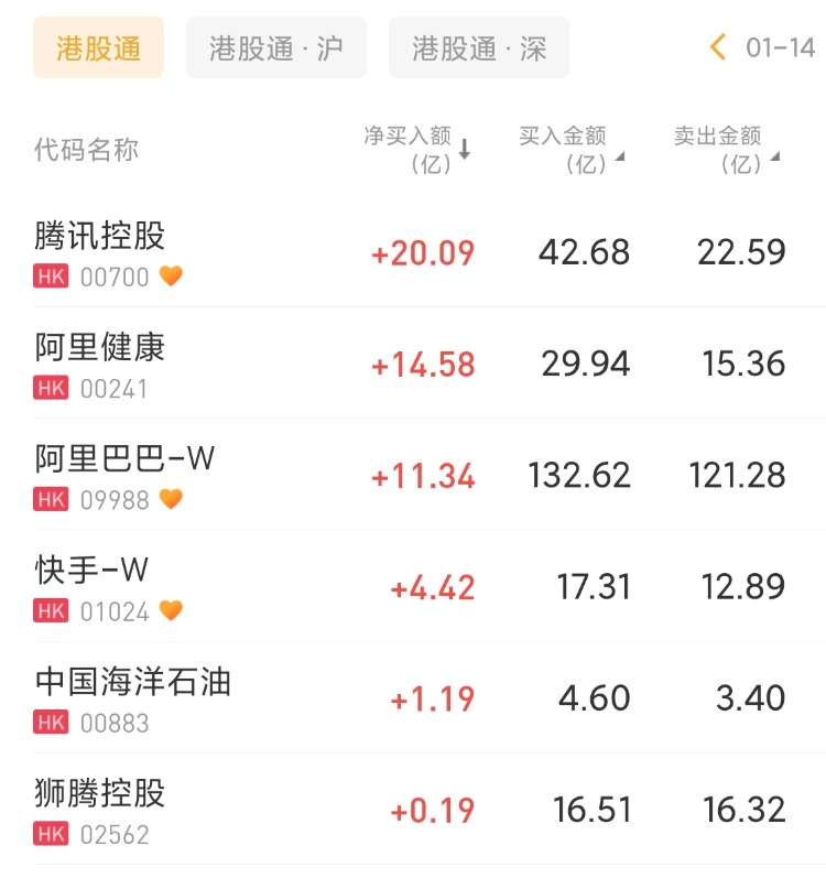 腾讯控股、阿里健康、阿里巴巴-W分别获净买入20.09亿港元、14.58亿港元、11.34亿港元;