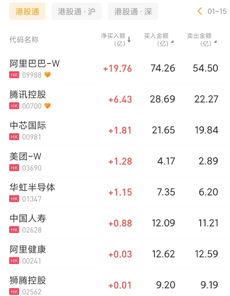 阿里巴巴-W、腾讯控股、中芯国际分别获净买入19.76亿港元、6.43亿港元、1.81亿港元;