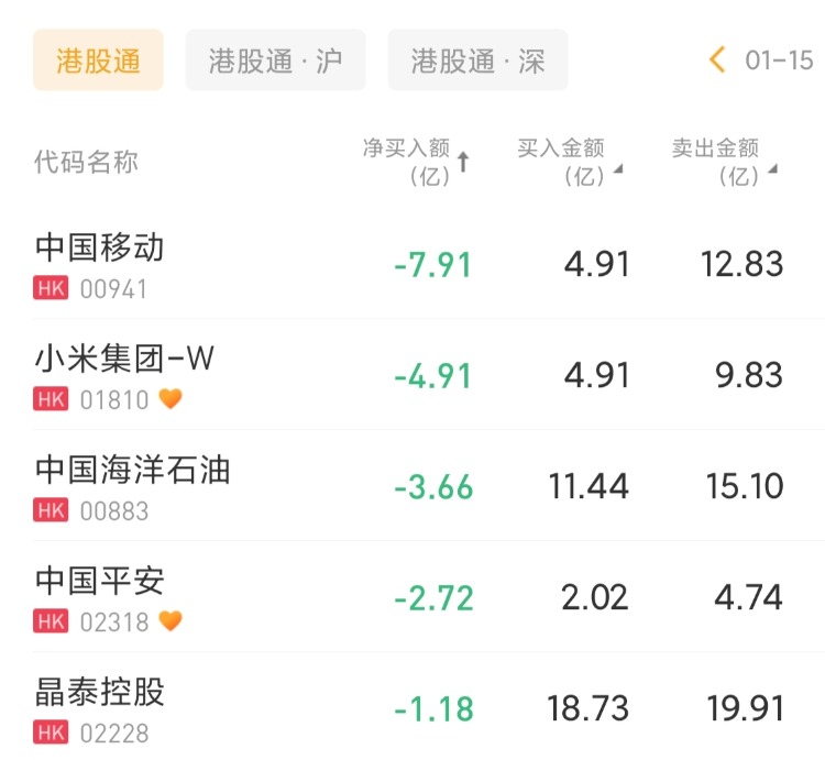 中国移动、小米集团-W 、中国海洋石油分别遭净卖出7.91亿港元、4.91亿港元、3.66亿港元。