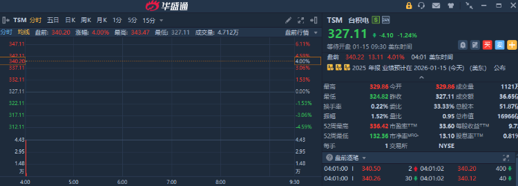 华盛资讯1月15日讯,美股半导体板块多股盘前走强,阿斯麦盘前涨超5%,台积电涨超4%。