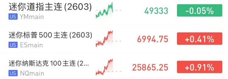 美股三大股指期货盘前涨跌不一,截至发稿,纳指期货 $NQmain 涨0.91%,标普500期货 $ESmain 涨0.41%,道指期货 $YMmain 微跌0.05%。
