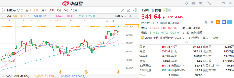 3、台积电:隔夜涨4.44%,收盘价报341.64美元。值得注意的是,该股盘中一度涨超7%刷新历史新高。