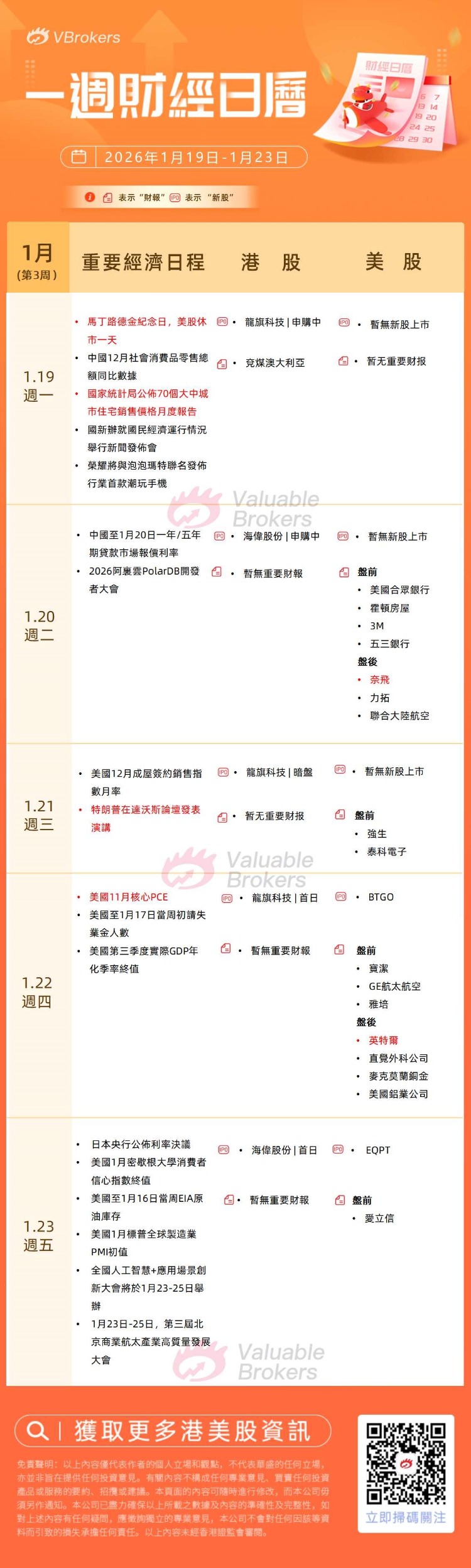 新股方面,龙旗科技预计下周四上市。财报方面,美股科技股奈飞、英特尔将披露Q4财报,此外,宝洁、强生、3M等道指重要成分股也将公布最新财报。