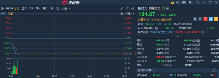 华盛资讯1月16日讯,热门中概股盘中普跌,阿里巴巴跌逾3%,京东、百度跌逾1%;网易逆势涨逾1%。