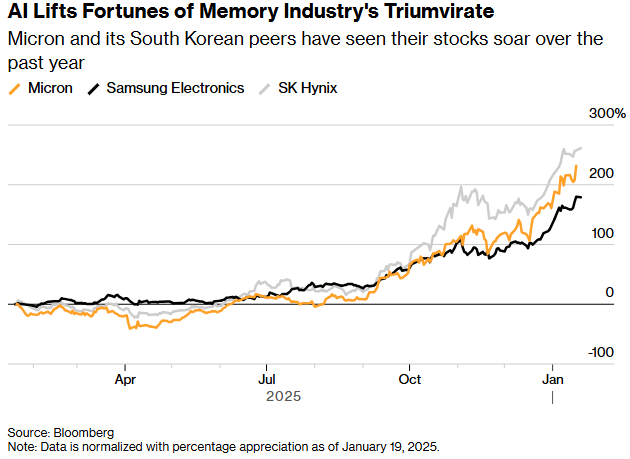 正是在这样的供需紧平衡驱动下,全球内存芯片行业的三巨头——美光、SK海力士和三星电子的股价在2025年均大幅飙升。SK海力士表示其2026年的全部芯片产能已售罄,而美光也表示其今年的人工智能内存半导体已被预订一空。