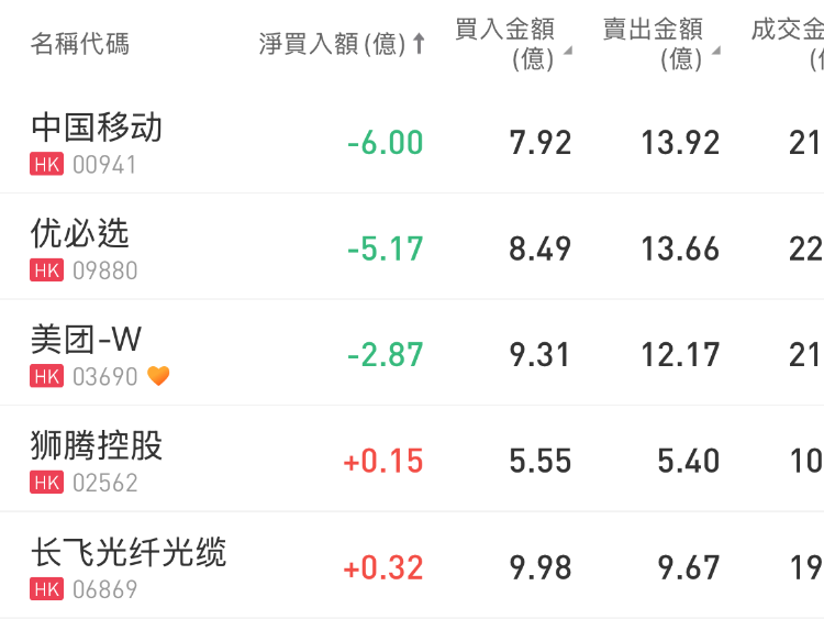 中国移动、优必选、美团-W分别遭净卖出6亿港元、5.17亿港元、2.87亿港元。