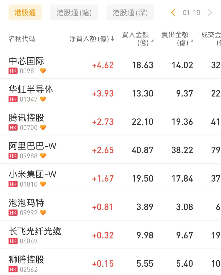 中芯国际、华虹半导体、腾讯控股分别获净买入4.62亿港元、3.93亿港元、2.73亿港元;