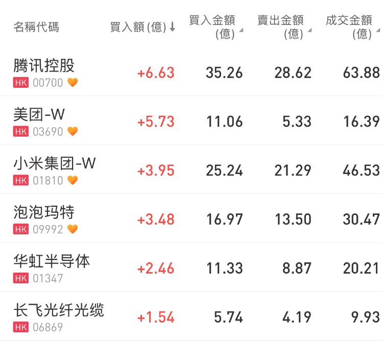 腾讯控股、美团-W、小米集团-W分别获净买入6.63亿港元、5.73亿港元、3.95亿港元;