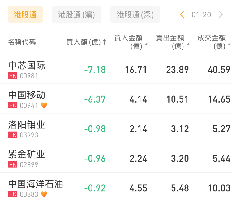 中芯国际、中国移动、洛阳钼业分别遭净卖出7.18亿港元、6.37亿港元、0.98亿港元。