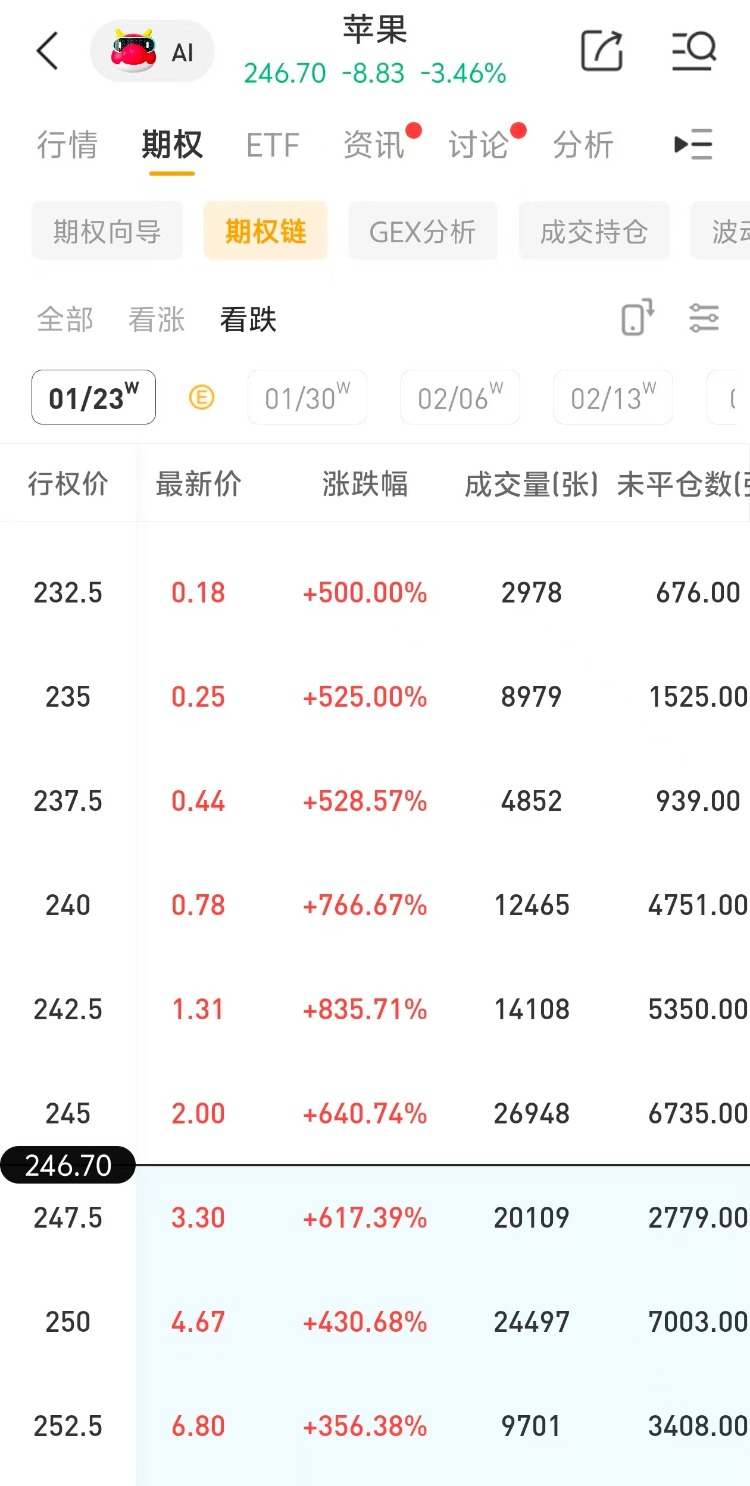 多张看跌期权大涨超500%!其中一看跌期权(AAPL_260123_P_242.5 )交易量达1.41万张,该合约行权价为242.5美元,行权日在2026-01-23,该张期权大涨超835%。