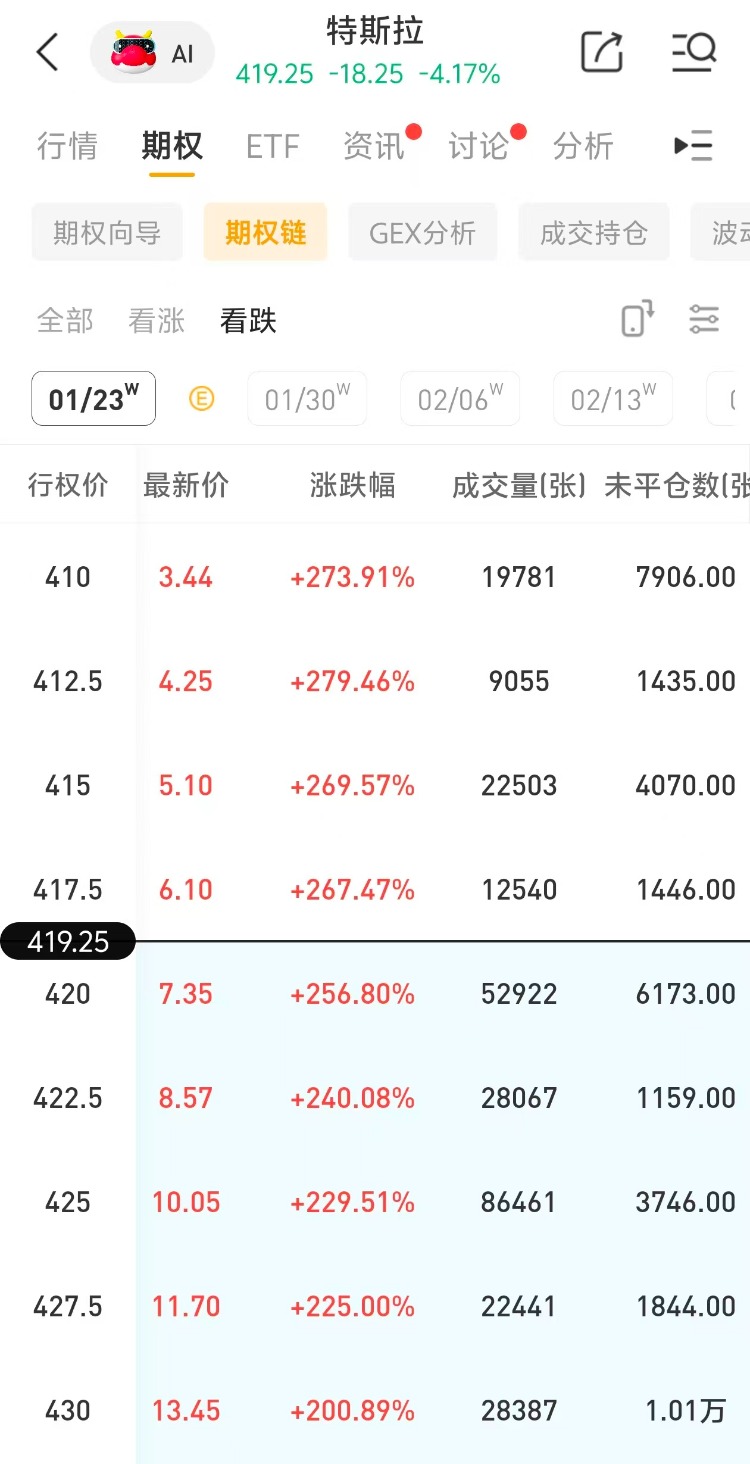 多张看跌期权集体大涨超200%!其中一看跌期权(TSLA_260123_P_425.0 )交易量达8.6万张,该合约行权价为425.0美元,行权日在2026-01-23,该张期权涨超229%。