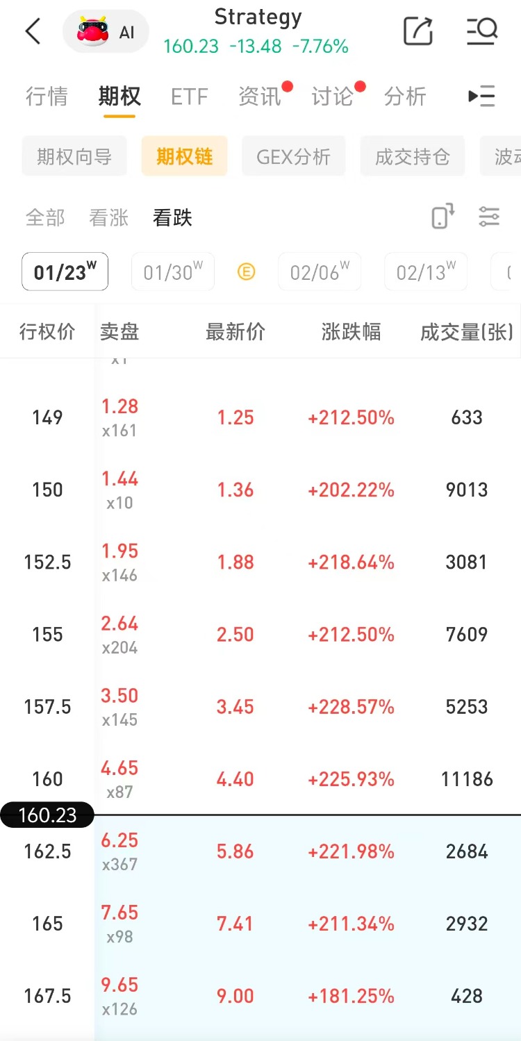 多张看跌期权大涨超200%!其中一看跌期权(MSTR_260123_P_160 )交易量达1.1万张,该合约行权价为160美元,行权日在2026-01-23,该张期权大涨超225%。