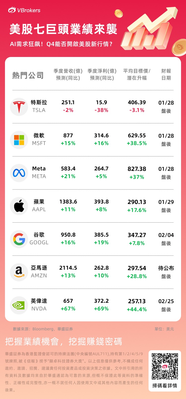 具体而言,微软、 $META 、特斯拉将于1月28日(周三)盘后打响七巨头业绩“开头炮”,苹果则是于1月29日(周四)盘后公布业绩,为1月的“七巨头”业绩收官;来到2月,谷歌将于2月4日(盘后)公布业绩,万众瞩目的英伟达业绩将于2月25日(周三)盘后公布。此外,亚马逊暂未公布业绩披露日期。