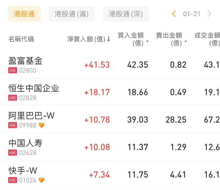 盈富基金、恒生中国企业、阿里巴巴-W分别获净买入41.53亿港元、18.17亿港元、10.78亿港元;