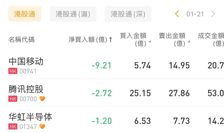 中国移动、腾讯控股、华虹半导体分别遭净卖出9.21亿港元、2.72亿港元、1.2亿港元。