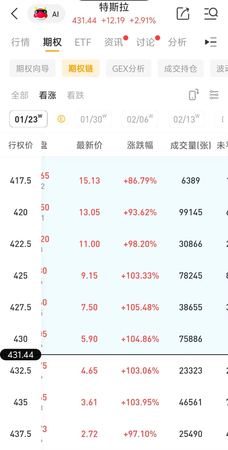多张看涨期权大涨超100%,其中一看涨期权(TSLA_260123_C_430.0)交易量达7.59万张,该合约行权价为430.0美元,行权日在2026-01-23,该张期权涨104.86%。