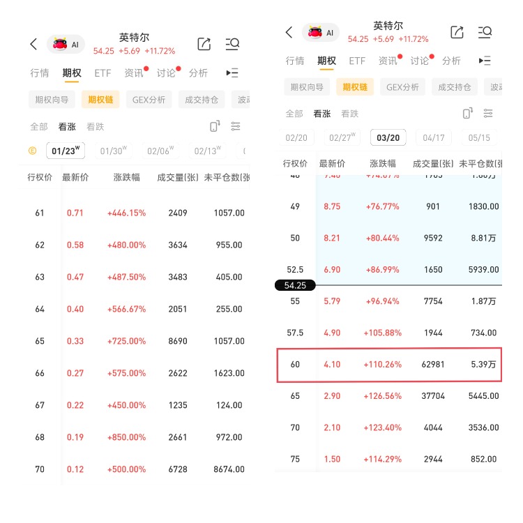 看涨期权成交活跃且集体飙升,涨幅最高达850%!其中一看涨期权(INTC_260320_C_60.0)交易量高达6.3万张,该合约行权价为60.0美元,行权日在2026-03-20,该张期权涨110.26%。