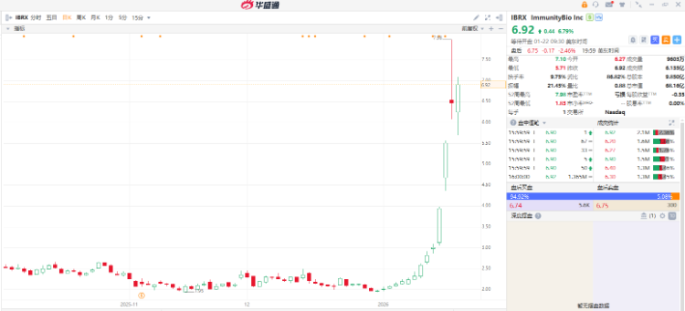 2、ImmunityBio :隔夜涨6.79%,收盘价报6.92美元。该股近期连续大涨,今年以来已暴涨超180%。该股近期期权成交活跃,当日期权总成交量达13.67万张,其中看跌期权占总成交量的23.18%,看涨期权占76.82%。