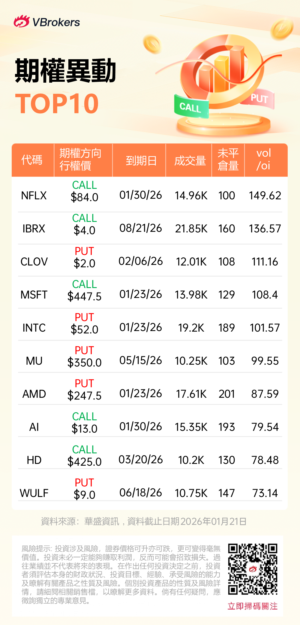 隔夜个股期权成交量前十位分别为:英伟达、特斯拉、奈飞、英特尔、美国超微公司、苹果、Palantir、微软、亚马逊、美光科技。