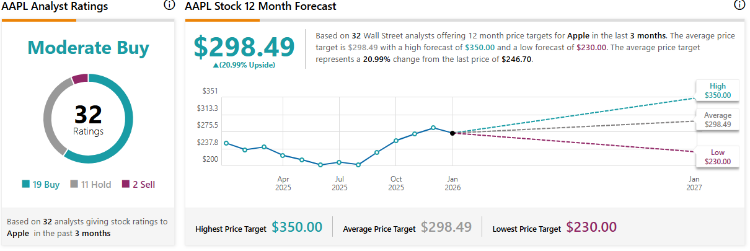 据TipRanks最新数据显示,多家华尔街大行绩前上调苹果目标价,59%的机构给予“买入”评级,当前平均目标价为298.49美元,最高目标价为350美元/股。