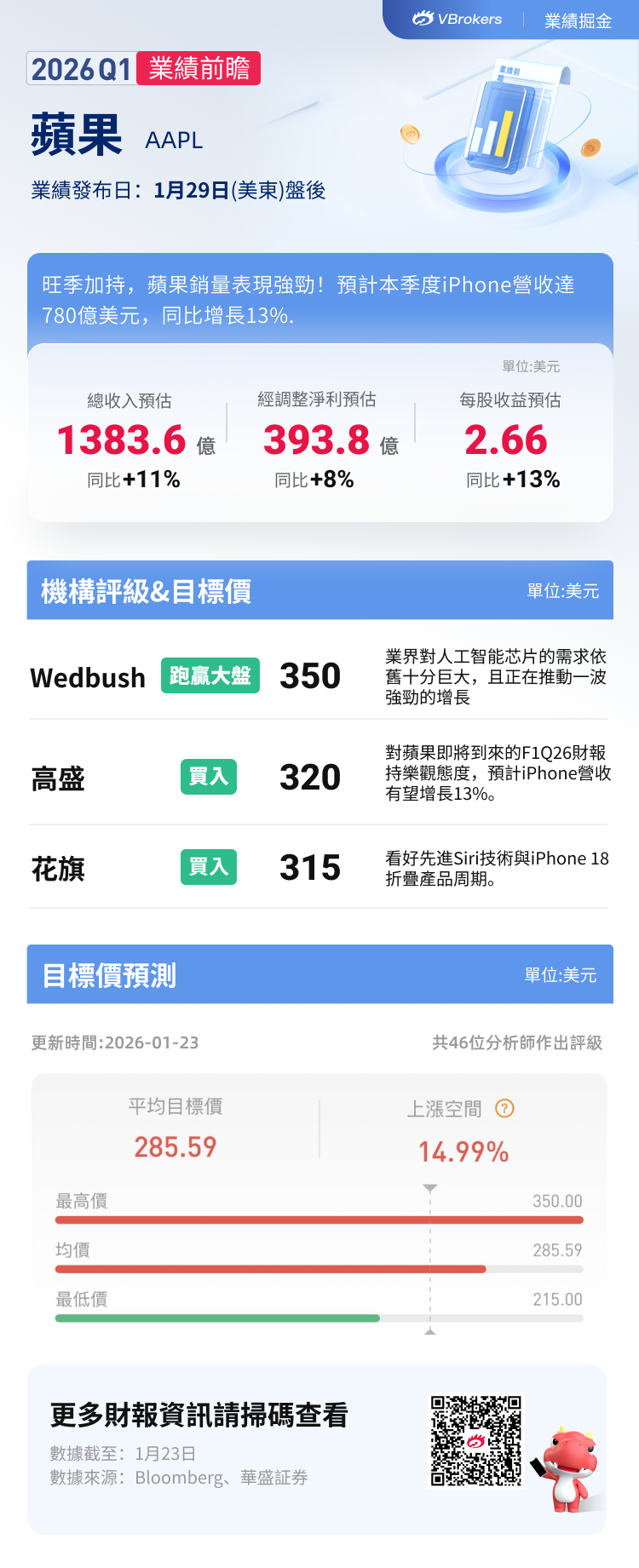 据彭博分析师预期,苹果2026财年第一季度营收为1383.6亿美元,同比增长11%;每股收益为2.66美元,同比增长13%。