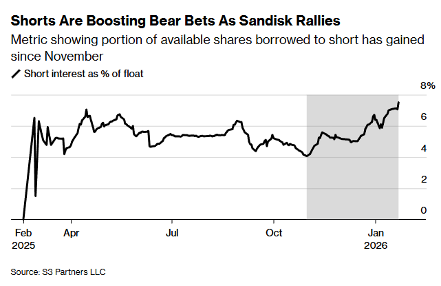 根据S3 Partners LLC的数据,随着存储芯片厂商Sandisk股价大幅上涨,该股的空头仓位在过去数月持续攀升,轧空风险已达到“极端”水平,空头仓位的按市值计亏损已达到约30亿美元。