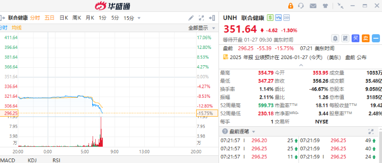 - 双重利空打击!联合健康盘前暴跌15%,Q4业绩不及预期