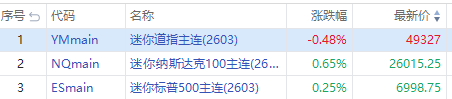 美股三大期指周二盘前走势分化,纳指期货 $NQmain 涨0.65%,标普500期货 $ESmain 涨0.25,道指期货 $YMmain 跌0.48%。