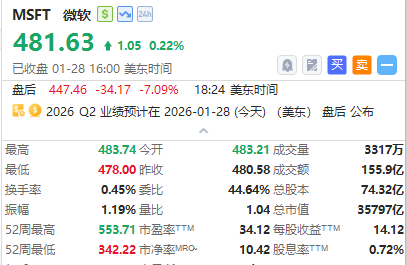 微软发布财报显示云业务增速放缓,公司股价在周三盘后跌超7%