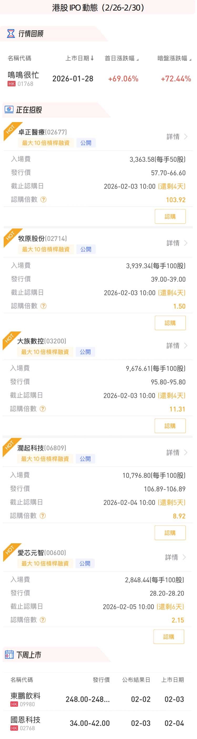中国第三大私立中高端医疗服务机构卓正医疗正在招股中,计划发行4750万股,一手入场费3363.6元,孖展认购倍数超71倍,预计将于2月6日上市,海通国际、浦银国际为联席保荐人。