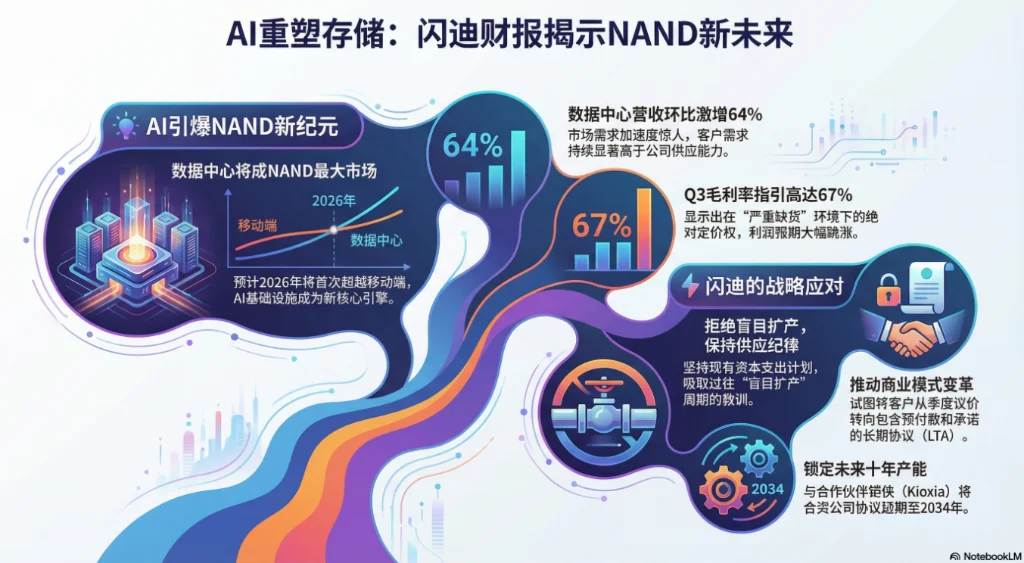 在今日Sandisk召开的业绩电话会上,管理层的带来的最新动态似乎有力打消了周期见顶的预期。在财报电话会议上,Sandisk管理层向市场传递了一个明确信号:AI浪潮对存储的需求并非阶段性的,而更像是一场正在发生的结构性变革。管理层认为,NAND正在摆脱传统的强周期属性,数据中心有望在2026年首次成为NAND的最大市场,从而持续支撑市场需求。