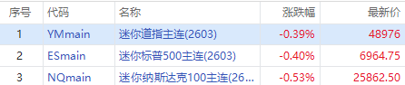 特朗普盘前宣布凯文·沃什将出任美联储主席,美股三大期指周五集体走低,纳指期货 $NQmain 跌0.40%,标普500期货 $ESmain 跌0.53%,道指期货 $YMmain 跌0.39%。