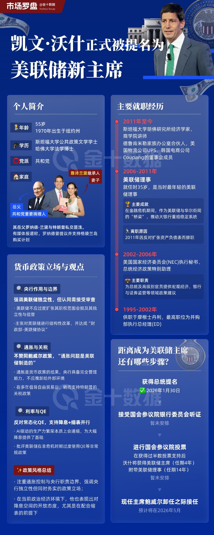 特朗普发文称,我很荣幸地宣布,提名凯文·沃什出任美联储主席。凯文现任胡佛研究所谢泼德家族杰出客座经济学研究员及斯坦福大学商学院讲师,同时也是杜肯家族办公室与斯坦利·德鲁肯米勒的合伙人。他持有斯坦福大学文学学士学位及哈佛法学院法学博士学位,在经济学与金融领域开展了广泛研究。