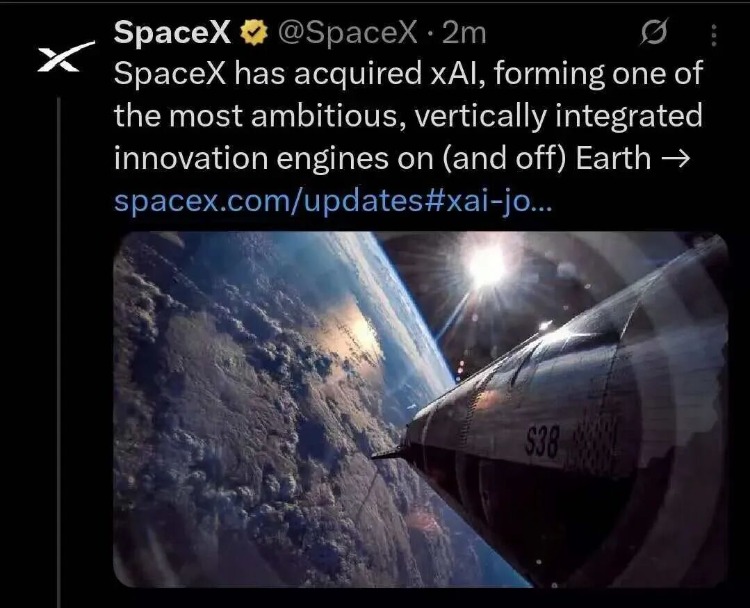 - SpaceX、xAI官宣合并!据称估值达到1.25万亿美元