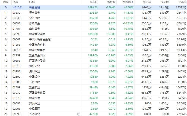 华盛资讯2月2日讯,港股有色金属概念股盘初普跌,灵宝黄金、金浔资源跌超11%,赤峰黄金、山东黄金跌超10%,中国黄金国际跌超9%,中国白银集团、紫金黄金国际、江西铜业股份均跌超8%,招金矿业、洛阳钼业、中国铝业均跌超7%,紫金矿业跌近6%,中国宏桥跌超4%,天齐锂业跌近4%。
