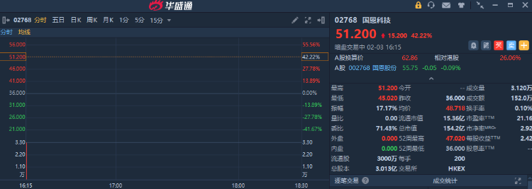 华盛资讯2月3日讯,港股国恩科技正在暗盘交易中,截至发稿涨42.22%,报51.2港元/股,中签一手账面浮盈约3040港元,最新总市值为154.2亿港元。