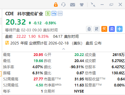 华盛资讯2月3日讯,贵金属股盘前反弹,科尔黛伦矿业 、泛美白银均大涨超9%,金罗斯黄金涨超6%;消息面上,现货黄金、白银价格均强势回升;