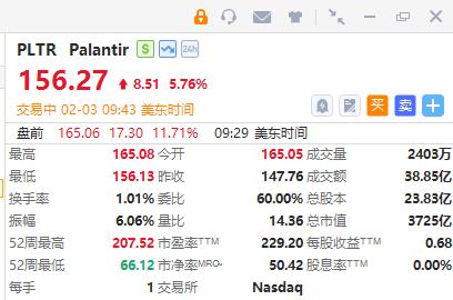 华盛资讯2月3日讯,科技股普遍强势!Palantir涨超5%,Q4业绩超预期,营收同比大增70%至14.1亿美元。