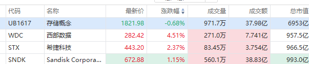 存储概念股部分走高,西部数据涨近5%、闪迪 $SNDK 涨超1%,均创历史新高,希捷科技 $STX 涨超2%。