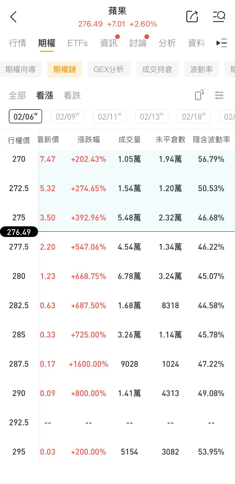 多张看涨期权涨超300%,其中一看涨期权(AAPL_260206_C_275.0)交易量达5.48万张,该合约行权价为275.0美元,行权日在2026-02-06,该张期权涨392.96%。