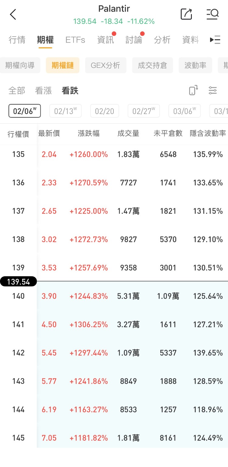 多张看跌期权涨超1200%!其中一看跌期权(PLTR_260206_P_140.0 )交易量达5.31万张,该合约行权价为140美元,行权日在2026-02-06,该张期权涨1244.83%。