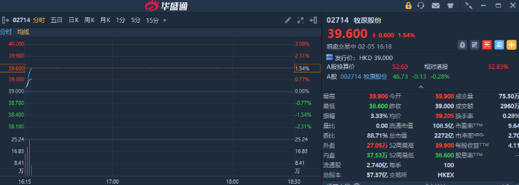 牧原股份涨1.54%,报39.6港元/股,中签一手账面浮盈约60港元,最新总市值约2272亿港元。