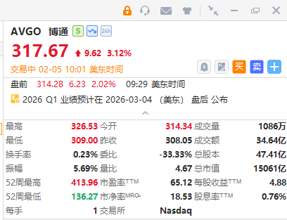 华盛资讯2月5日讯,美股芯片股走高,博通涨超3%,台积电、阿斯麦、AMD、应用材料、英伟达涨超1%;