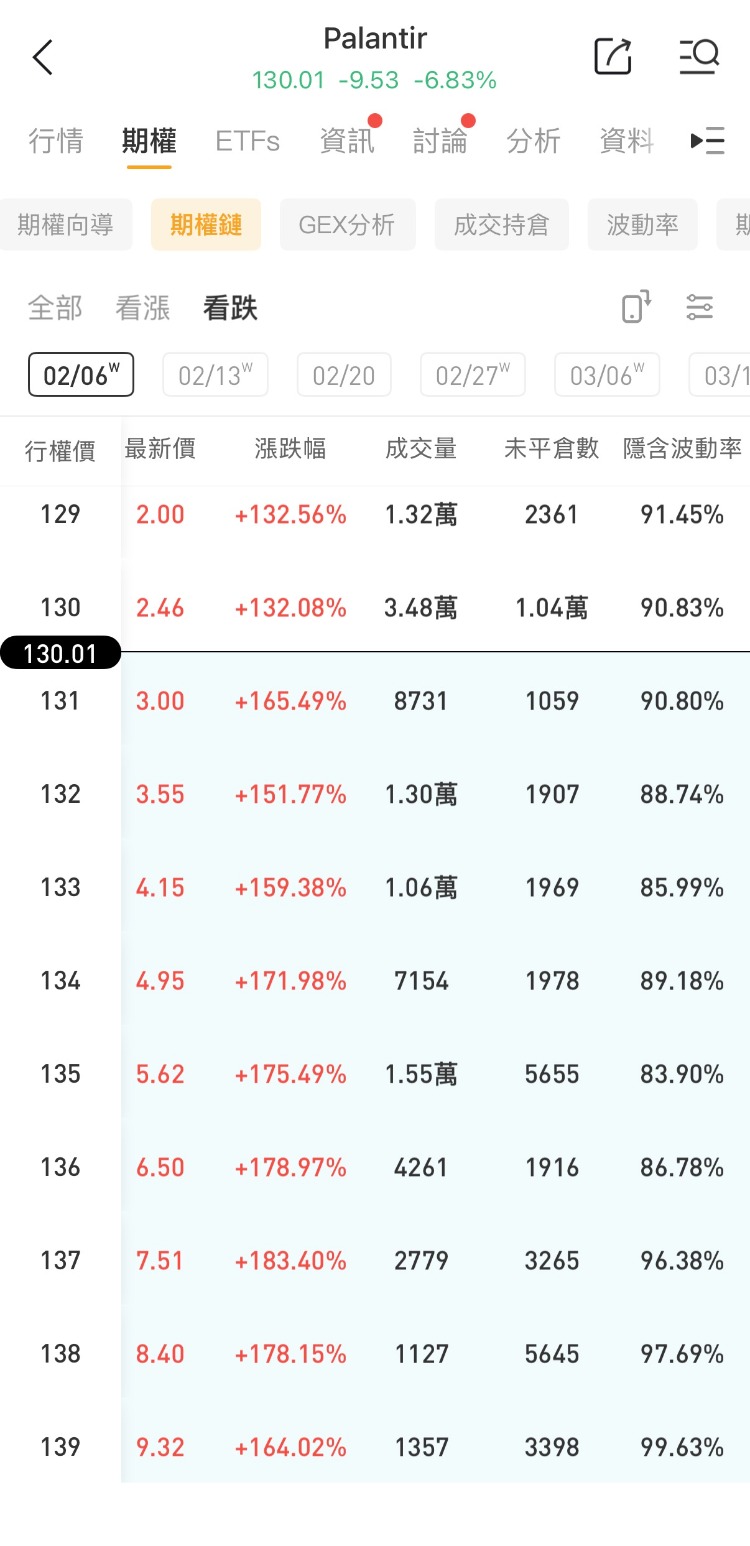 多张看跌期权涨超130%,其中一看跌期权(PLTR_260206_P_130.0 )交易量达3.48万张,该合约行权价为130.0美元,行权日在2026-02-06,该张期权跌132.08%。