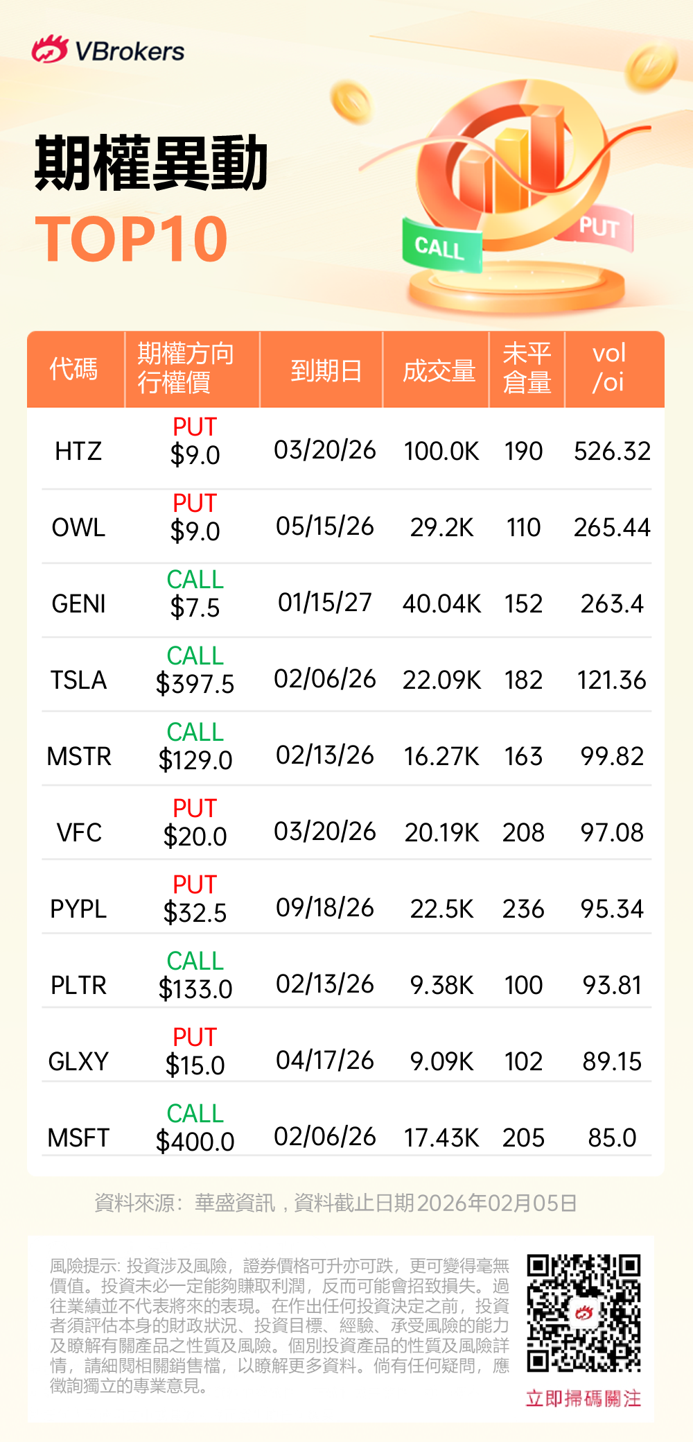 - 一看跌期权(HTZ_260320_PUT_9.0 )Vol/OI 比率高达526.32,成交量达10.0万张,未平仓量190张,行权价为9.0美元,行权日在2026-03-20,该张期权涨32.06%,意味着显示有资金在继续押注公司长期下行风险。
